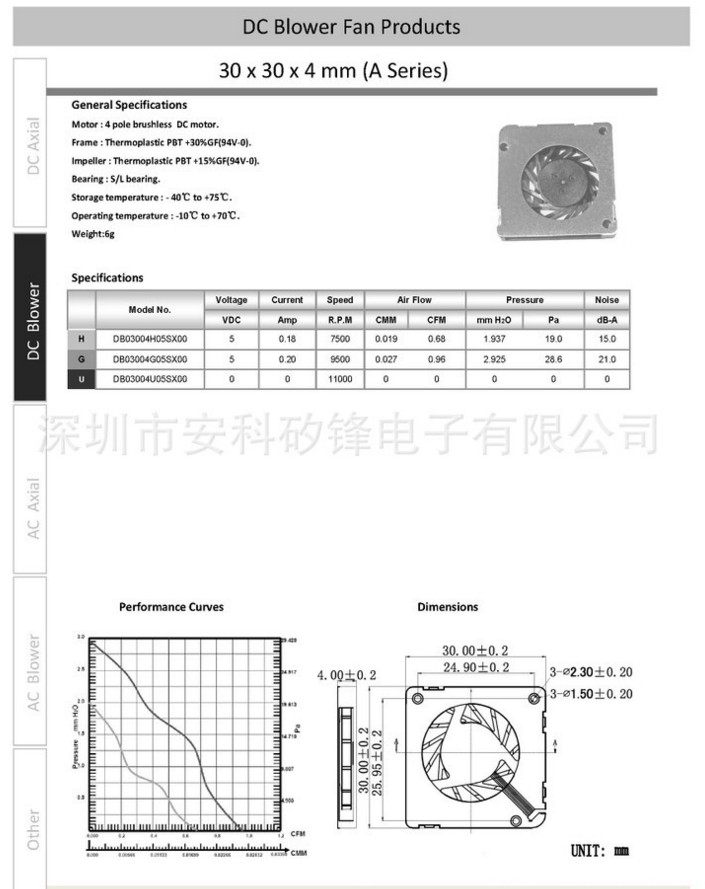 2017年6月30*30*4mm(7500rpm/0.68CFM/19Pa/(5厘米噪音30至32dBA )